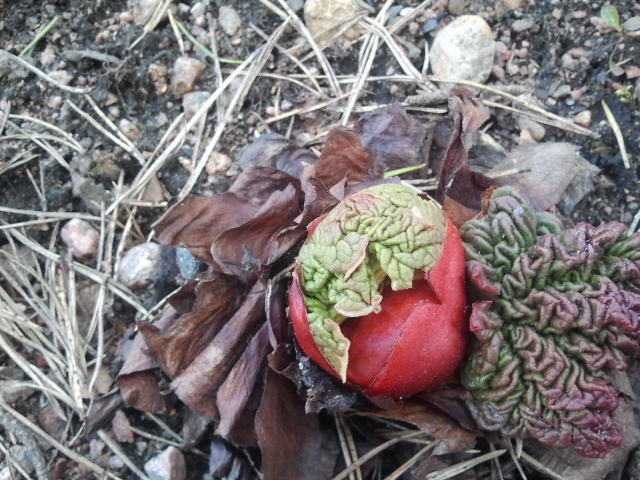 Ett annat av Gubben Guds underverk är rabarbern. Från denna färgglada knöl växer det snart fram saftiga stänglar och stora gröna blad. Med hjälp av de stora fina bladen och cement kan man göra praktiska trädgårdsprydnader. Men vill ni veta hur det går till måste jag vända mig till min svägerska för att få exakta råd.