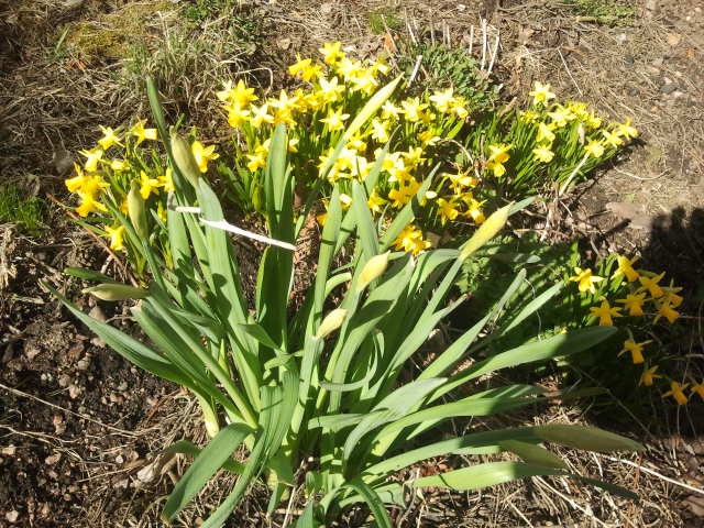Som små solar välkomnar minipåskliljorna oss till bakgården.