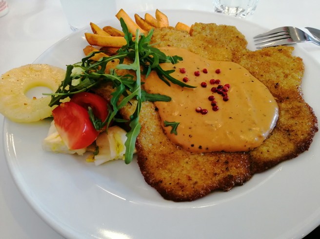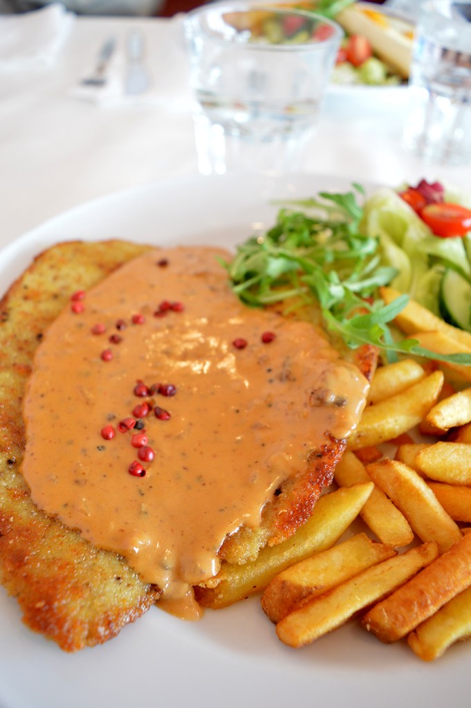 Troligen sommarens sista pepparschnitzel på Café Skeppsbron igår. Säsongen är inte slut där, men menyn ändras och utbudet minskar ju närmare hösten vi kommer. Schnitzlar finns kvar, men inte alla varianter av såser. Det här är min absoluta favorit. Varje sommar väntar jag lika mycket på att den ska tas med på menyn 🙂