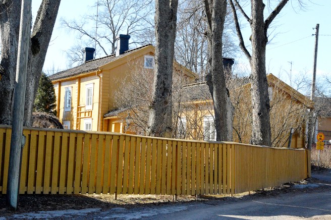 Huset tillhör Pilastrarna i Lovisas gamla stadsdel. Där finns lite text på engelska men annars bara på finska.