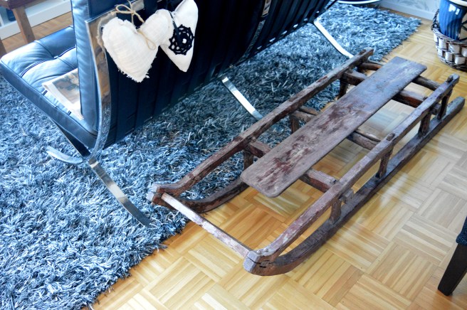 Jag behöver plats för mina krukväxter, så jag tänkte att jag tar in den gamla kälken i trä. Ett kärt minne. Tror att min mamma som liten var med om att dra stora mjölkkannor på den över snödrivorna.