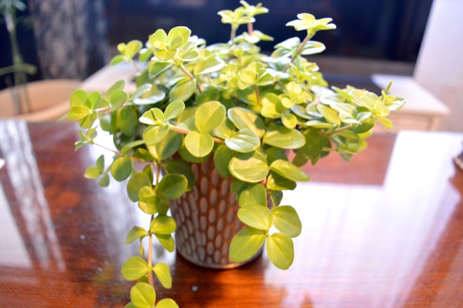 För att få in lite av våren till mig själv gick jag till blomsterhandeln bakom hörnet och köpte en Rotundifolia Peperomia, även linspeperomia eller ören-på-snören kallad.