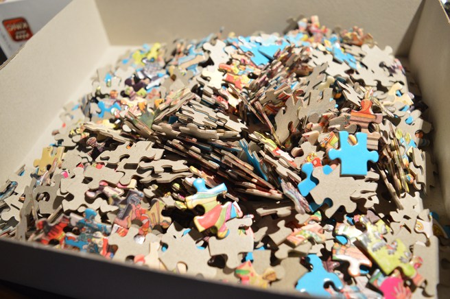 Och hur lång tid tar det att bryta upp ett pussel som består av 1500 bitar? Ungefär en halvtimme, om man gör det grundligt. Alltså så att man bryter loss alla bitar var för sig och inte lämnar några ”färdigt-pusslade flak”.