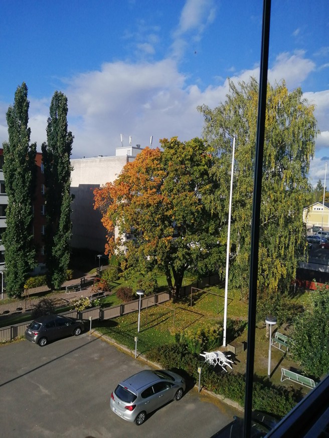 Skojigt är det också att jämföra hur utsikten såg ut från min balkong lördagen den 19 september och hur färgen på träden har ändrats sedan dess. Inte mycket men en aning ändå 🙂