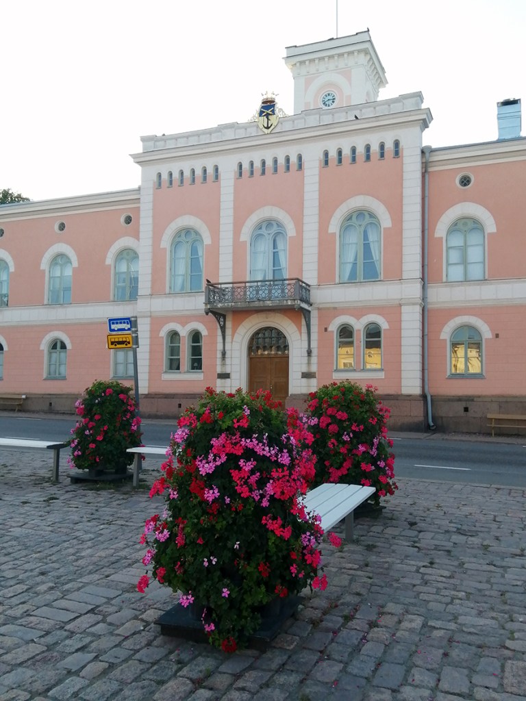 I bakgrunden vårt inpaketerade rådhus, även av mig bakelsen kallad. Renovering pågår. Bland annat ska vissa fönster bytas ut om jag minns rätt.