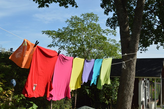 Tvättlinor i regnbågens färger finns lite här och där i stan för att ge stöd åt sexuella minoriteter.