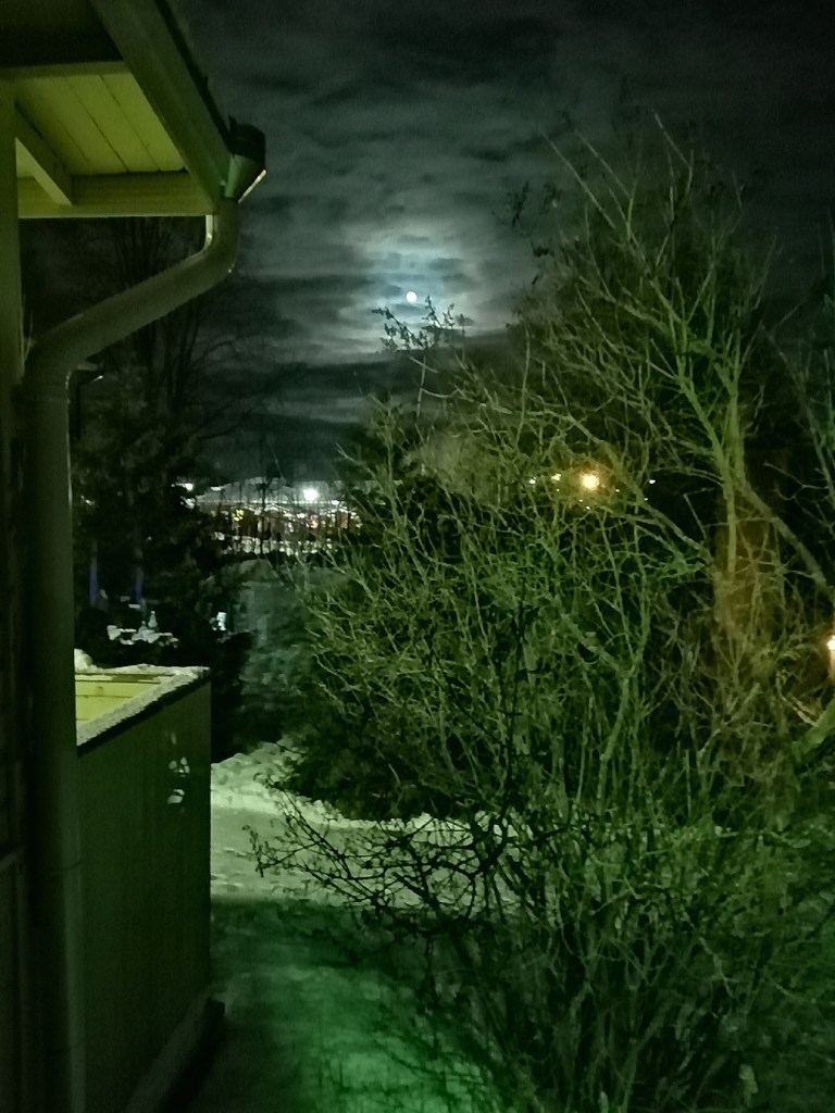 Det betyder att jag sover knaggligt igen ett par nätter. Vet inte om det alltid beror på månen, eller omdet bara är en slump, och sammanfaller med saker jag grubblar över. För i natt vaknade jag 03.38 och gick på toa. Såg då hurdant väldans oväder det var ute.