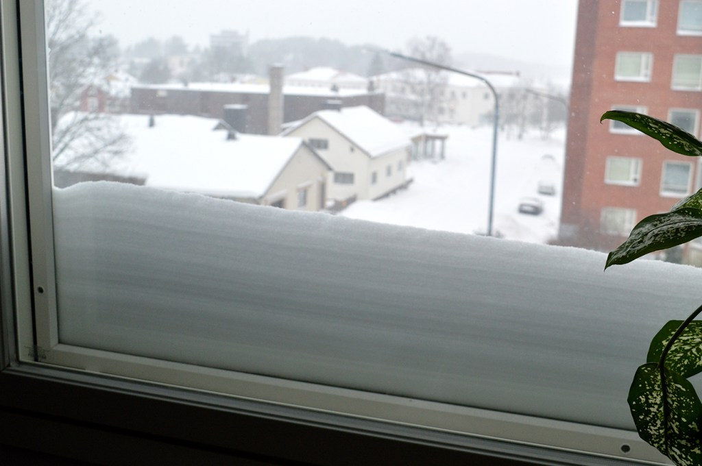 Så här såg det ut på balkongen innan jag hade putsat lite snö bort från vänstra fönstret, det som går att öppna inåt.