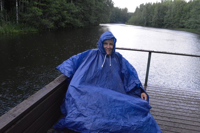 Jag tänkte att de andra resenärerna måtte ha funderat vad jag var för en typ. Först sitter jag alldeles tyst = stum av beundran inför orörd finsk natur (men dom kunde ju inte veta vad jag tänkte). När det sedan börjar regna skrattar jag hejdlöst, för att jag tänker att vi ser ut som ett gäng aliens 😀