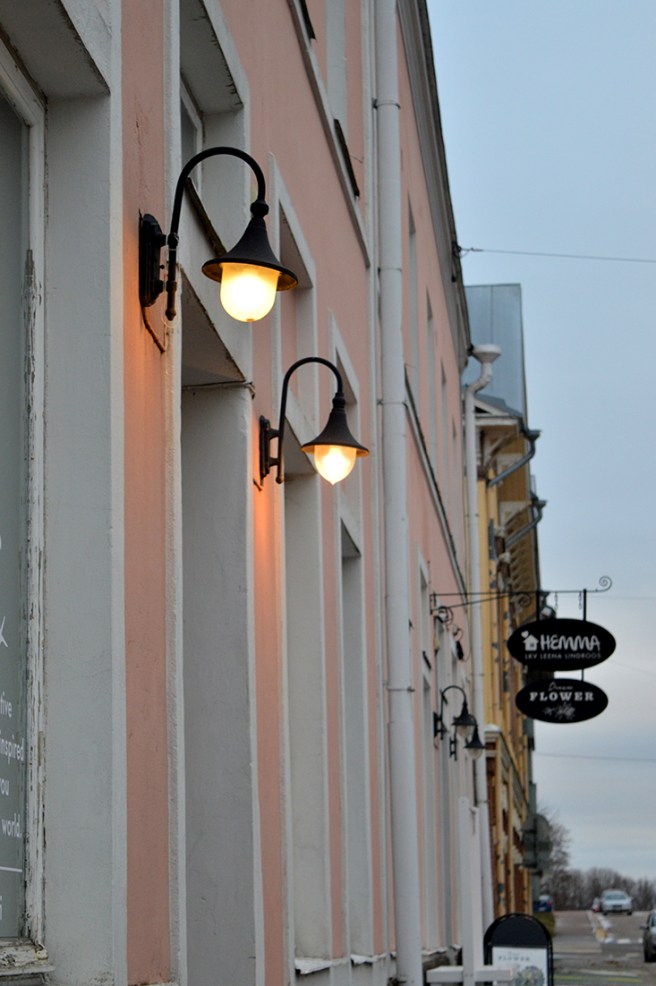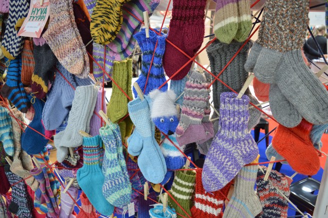 Utanför hantverksaffären Hulda Huoleton brukar det finnas olika intressanta produkter. Tror inte att de här är till salu, men idén med de hängande strumporna är kul ändå.