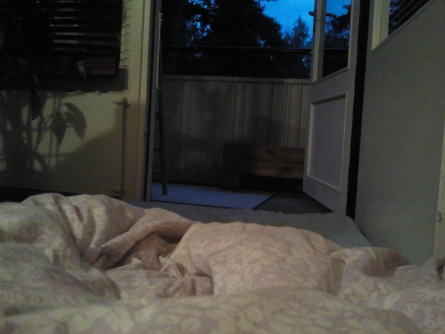 Plan B för att få en skön och sval natt är att lägga sig på golvet på en madrass med huvudet halvvägs ute på balkongen. Mysigt, inte sant?