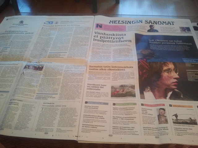 Brist på läsning råder ändå inte i vårt hus. Det finns tidningar i massor. Som till exempel fredagens Helsingin Sanomat där det fanns flera intressanta artiklar om Sofi Oksanen och hennes bokrelease i Tallinn.