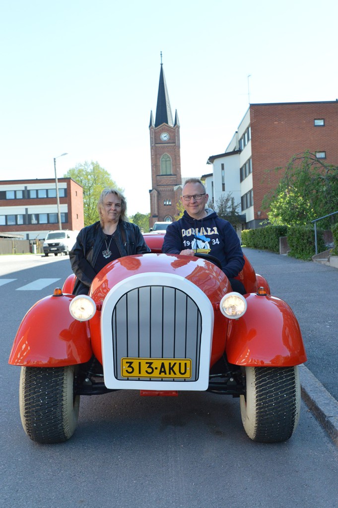 Det artar sig, tomatplantorna växer. Nu omplanterade i flera krukor och då vi haft sol nästan hela dagen i dag blir det mycket varmt på en inglasad balkong. Det gäller att vattna mycket.Då jag kom från massagen i dag tog jag i all hast ett foto av syrenbusken på granngården.Innan åkturen med Kalle Anka-bilen. Mikko Seppälä som byggt bilen, och jag som skrev ett reportage om den i Nya Östis den 2 juni. Fotot har tagits av Pia Calenius.