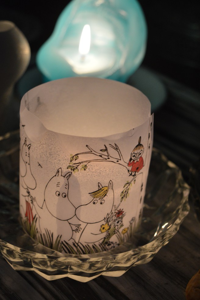 Mumin ger tröst på många sätt nu då vardagen för många ej känns så lätt. På sekretären står ljuset och sprider lite trygghet i oroliga tider. Med ett öga jag på nyheter tittar, medan jag nya pusselbitar hittar. Muminmotiv på bordet även där, min vardag är sådan, precis nu och här.