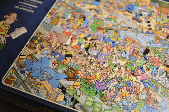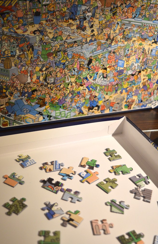 Detaljstudie av pusslet jag håller på med just nu. Med motiv från en mer eller mindre kaotisk födelsedagsfest för barn 🙂