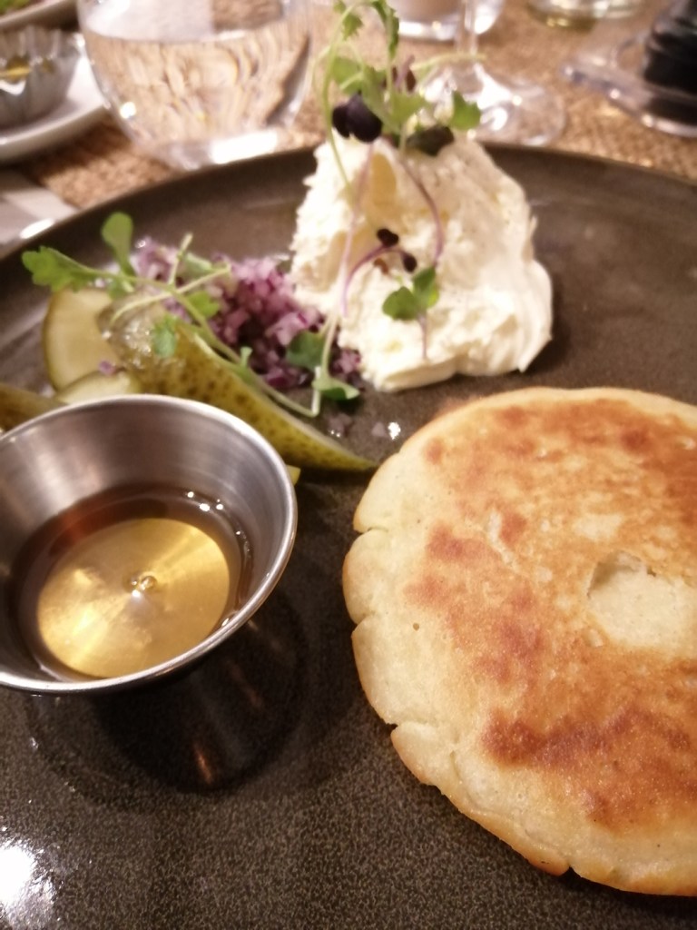 Det blev en lite suddig bild. Men de här blinierna på Bistro Kronan var jättegoda! Samma boveteblandning, men nu bad jag om att få små och tunna blinier och det blev tre stycken.