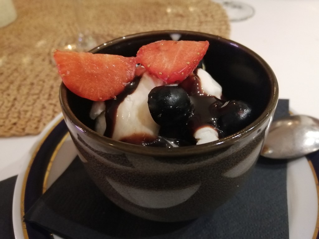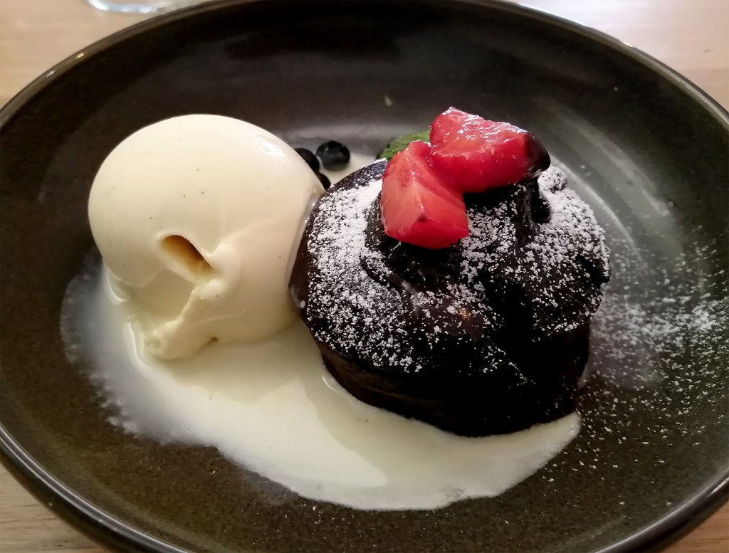 Detsamma gällde efterrätten, varm chokladfondant med vaniljglass, jordgubbar och blåbär. Och bär som smakar bär ska det förstås vara 🙂