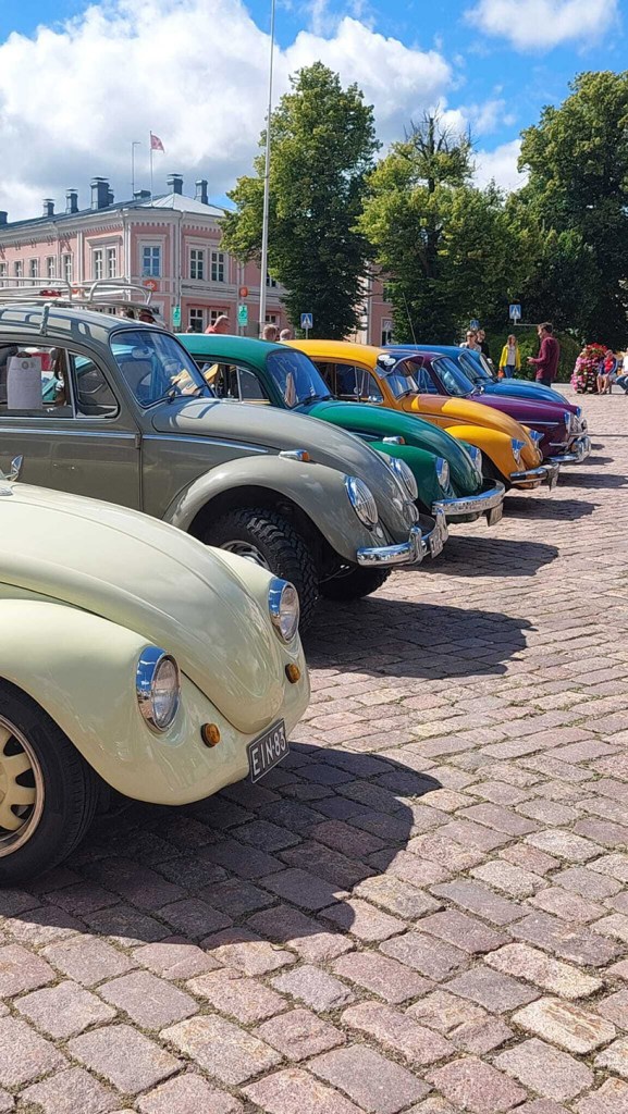 Jag hade inga egna foton av veteranbilar, som är temat hos Åke i Hoppa på tåget. Men jag kan använda en bild som min syster Veronica fotograferade för några veckor sedan då det var VW-meeting i Lovisa. Jag tror att en del av de här bilarna platsar in i temat?