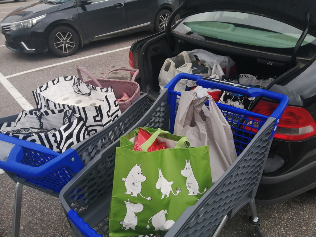 Vi säger ibland med syrran och grannen då vi en gång i veckan åker på uppköp att det ser ut som om vi handlade till en familj med sju personer. Bakluckan är sprängfylld med varor och halva baksätet även belamrat av kassar.