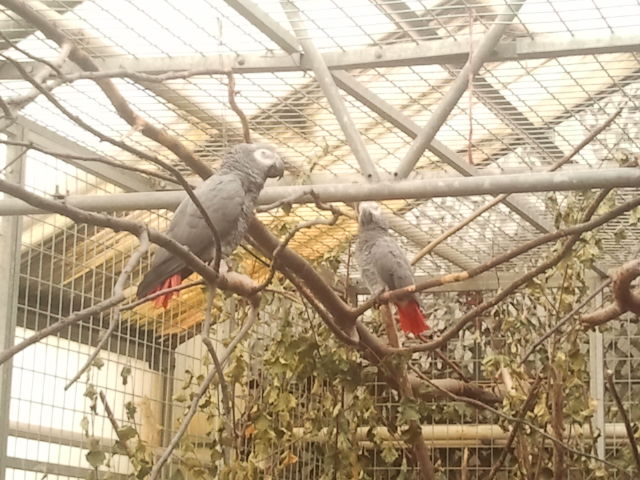 En del fåglar var fria inne i Fjärilshuset, men de här hade en stor bur.