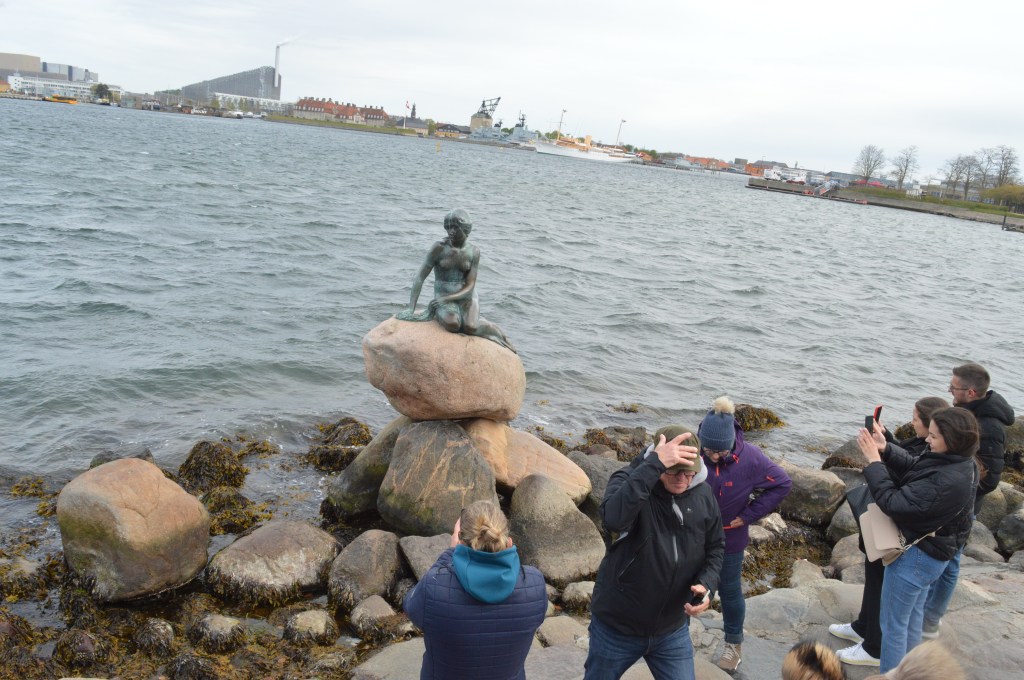 Här ser man inte hur mycket det blåser, men det var så kallt att vi bara rusade från bussen till Den lille Havsfrue och tillbaka. ”Du har inte sett Köpenhamn om du inte har varit här” lär det enligt guiden sägas. I bakgrunden Kungaskeppet Dannebrogen.