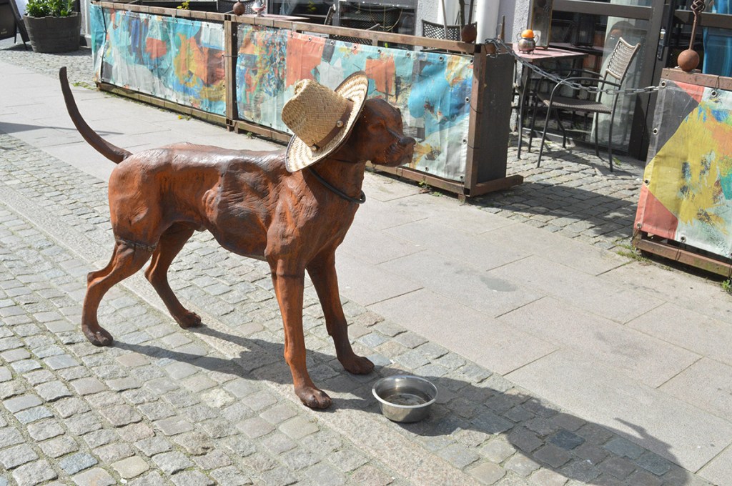 Att även hundar är välkomna till restaurangens uteservering tror jag att det här betyder. Bilden är tagen i Ystad fredagen den femte maj. Det blåste alldeles infernaliskt mycket den dagen. Guiden sa att det ofta blåser i Ystad, men just den här dagen blåste det extra mycket. Så det var ganska folktomt på gatorna.