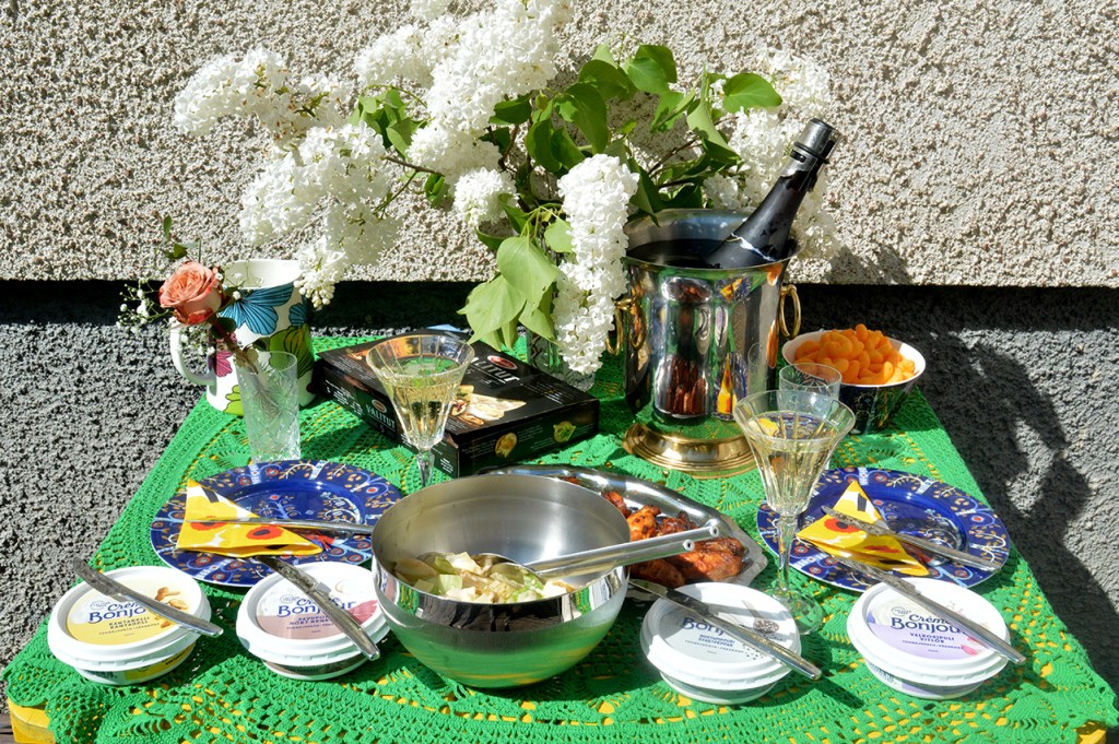 I går hade min väninna Marina dukat så fint i Gropis, på gården till hennes barndomshem. Syrenerna är vackra och doftar gott, dryckerna väl avkylda och antalet bredbara ostar många och goda. Här är det inte Supgränd som gäller fastän vi tog våra små supar, adressen är en annan gränd 🙂
